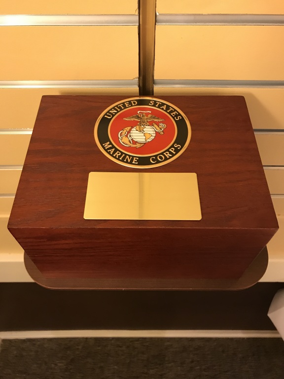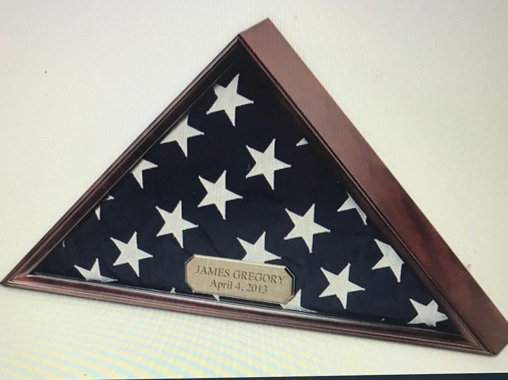 - Cherry finished wooden flag box with clear front with the veterans branch of service emblem and engraved name plate for the US Burial Flag.